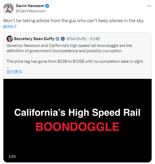 同一天,美國交通部長肖恩·達菲證實,終止了約40億美元用於加州高鐵建設的聯邦撥款。達菲在社交媒體上抨擊加州州長紐森和加州高鐵項目,稱其為“政府無能、甚至可能腐敗的典型例子”。