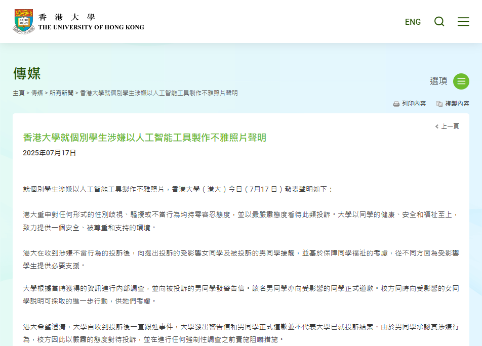 香港新聞網7月17日電 就個別學生涉嫌以人工智能工具製作不雅照片,香港大學(港大)今日(7月17日)發表聲明如下: