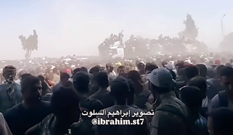 同一時間段拍攝的地面視頻顯示,一大群人將卡車團團圍住,地面上人頭攢動,卡車上也“掛”滿了人。數十名男子互相推擠著從卡車上往下搬運貨物,人多得幾乎看不見任何車體,就連車頭處也有人往上爬。