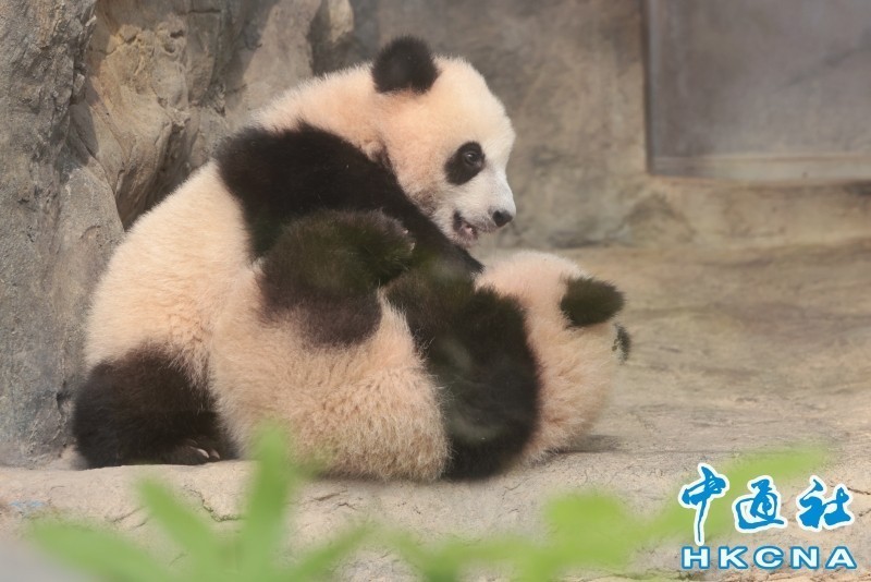 香港大熊貓龍鳳胎“加加”和“得得”。香港中通社圖片