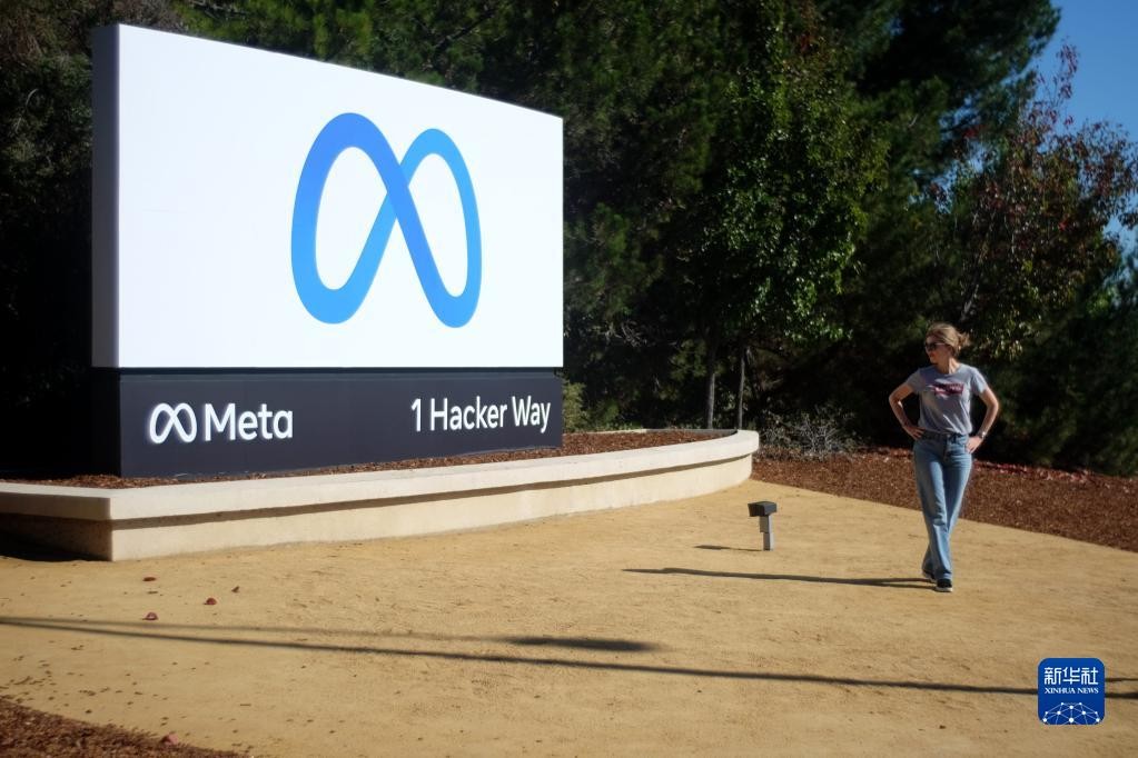 2021年10月28日,在美國舊金山灣區,人們在“元”標誌牌前留影。新華社資料圖