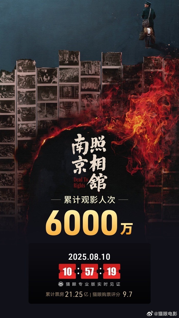 香港新聞網8月10日電 截至2025年8月10日,歷史題材電影《南京照相館》全國觀影人次突破6000萬,總票房達21億元,成為暑期檔大黑馬。這部由申奧執導、以南京大屠殺為背景的影片,自7月25日上映以來,憑藉其獨特的叙事視角和深刻的歷史還原能力,持續引發全民觀影熱潮。