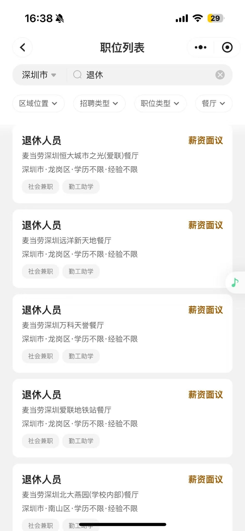 目前,在麥當勞的招聘小程序中,“退休返聘”仍是一個重要的招聘類型,涉及崗位包括餐廳員工、值班主管和共享清潔員等。(完)