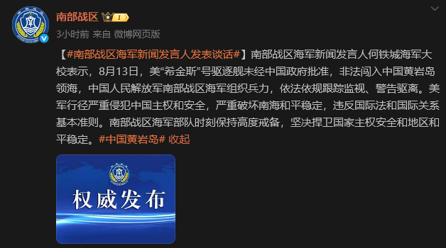 香港中通社8月13日電 中國人民解放軍南部戰區海軍新聞發言人何鐵城海軍大校13日表示,當日,美“希金斯”號驅逐艦未經中國政府批准,非法闖入中國黃岩島領海,中國人民解放軍南部戰區海軍組織兵力,依法依規跟蹤監視、警告驅離。