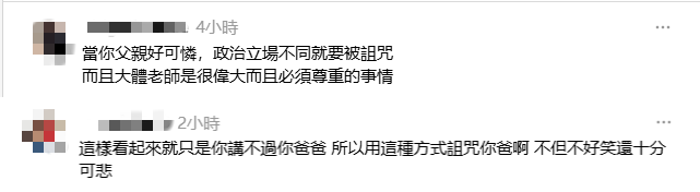 這般“公審家人”的行為,讓許多台灣網友感到不可思議,“青鳥起手式:對政治狂熱到,瘋起來連父母都可以咒罵。”“別被政治沖昏腦到基本的倫理道德都忘了。”“這樣看起來就只是你講不過你爸爸,所以用這種方式詛咒你爸啊,不但不好笑還十分可悲。”