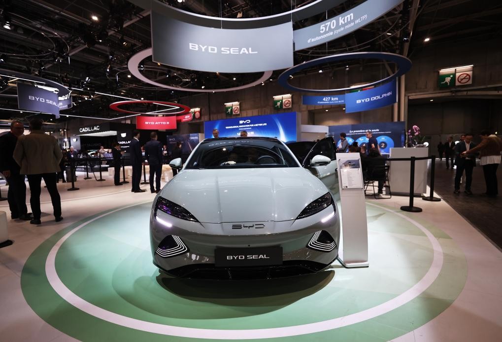 2024年10月14日,人們在法國巴黎凡爾賽門展覽中心舉行的2024巴黎車展媒體開放日上參觀比亞迪展台。新華社資料圖