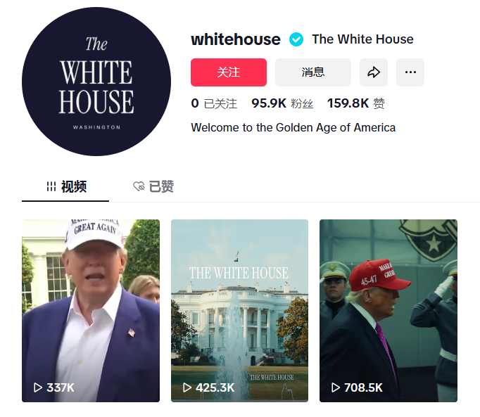 白宮在TikTok的賬號“whitehouse”當日晚間上線,首條27秒視頻,特朗普和美國副總統萬斯、國防部長赫格塞思等其他政府官員均出鏡,畫外音“我就是你們的聲音”,貼文稱“歡迎來到美國的黃金時代”。視頻發布1小時後,白宮賬號已吸引到4500名粉絲。