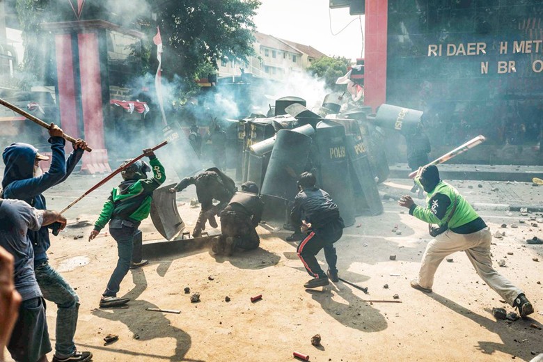 8月29日,在雅加達警察機動部隊總部外,示威群眾與警方爆發暴力衝突,抗議警方的鎮暴車28日晚上碾死一名私召電單車騎士。圖自社交媒體