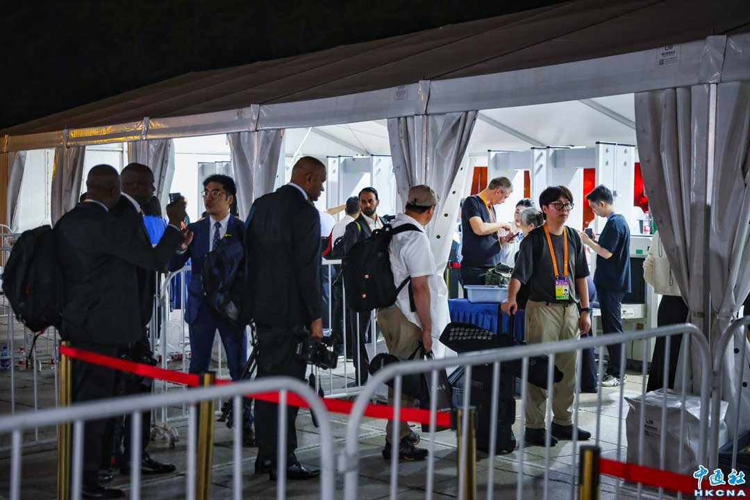 9月3日凌晨3時45分許,大批採訪中國人民抗日戰爭暨世界反法西斯戰爭勝利80週年紀念活動的中外記者排隊等候安檢。(香港中通社記者 謝光磊攝)