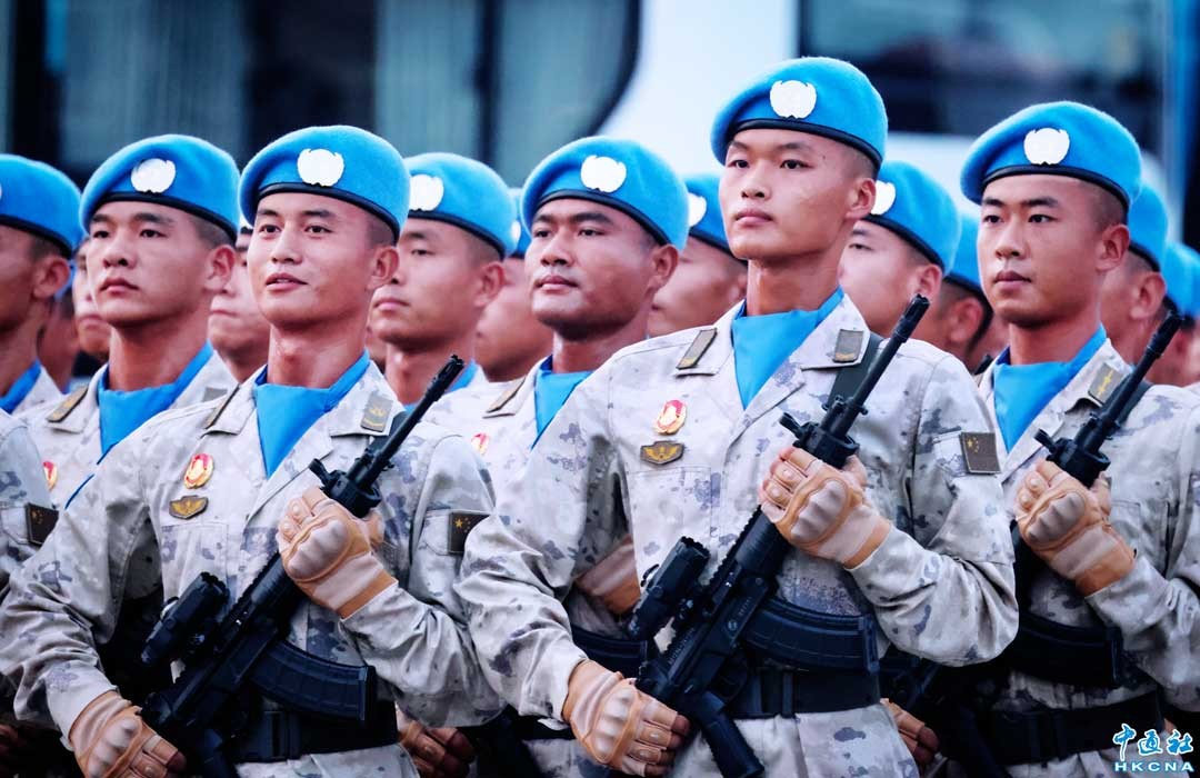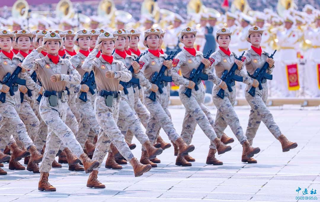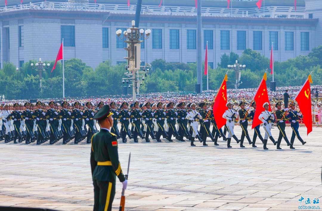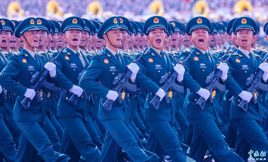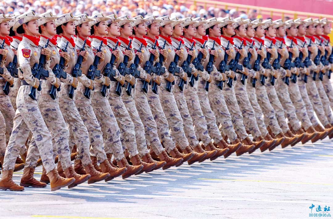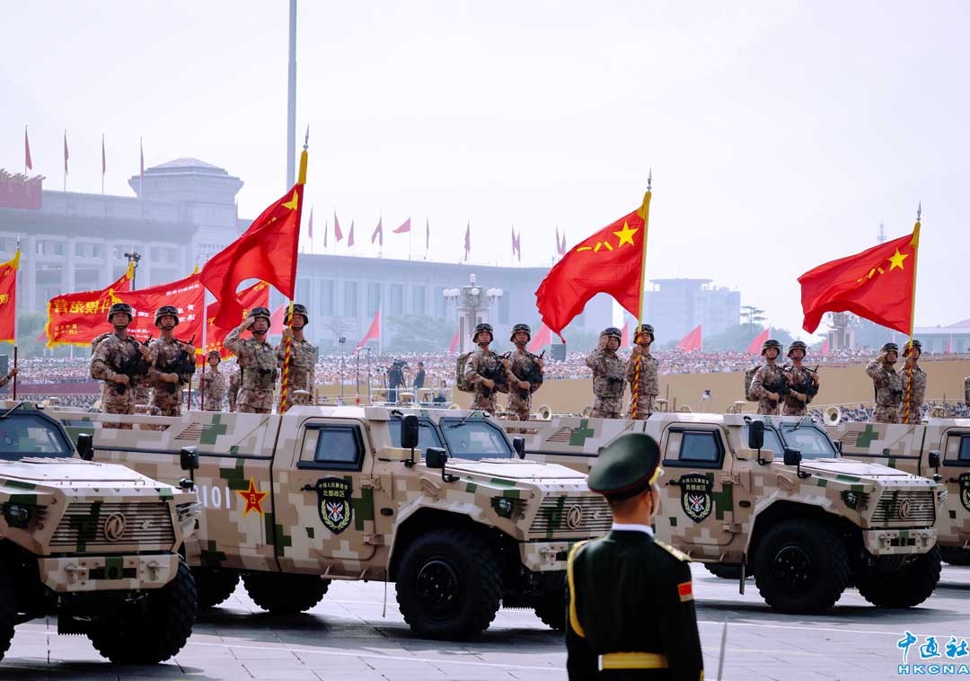 三軍徒步方隊接受檢閱。(香港中通社記者 謝光磊攝)