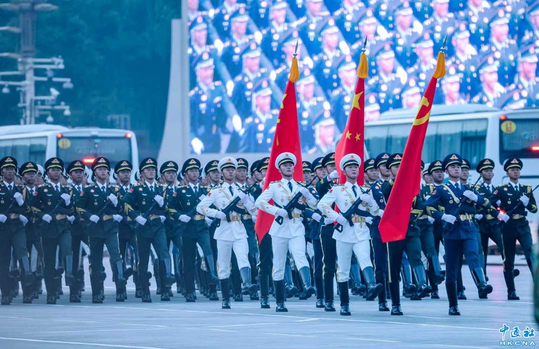 清晨5時30分許,受閱部隊抓緊後的時間進行綵排。(香港中通社記者 謝光磊攝)