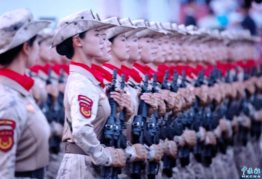 民兵方隊接受檢閱。(香港中通社記者 謝光磊攝)