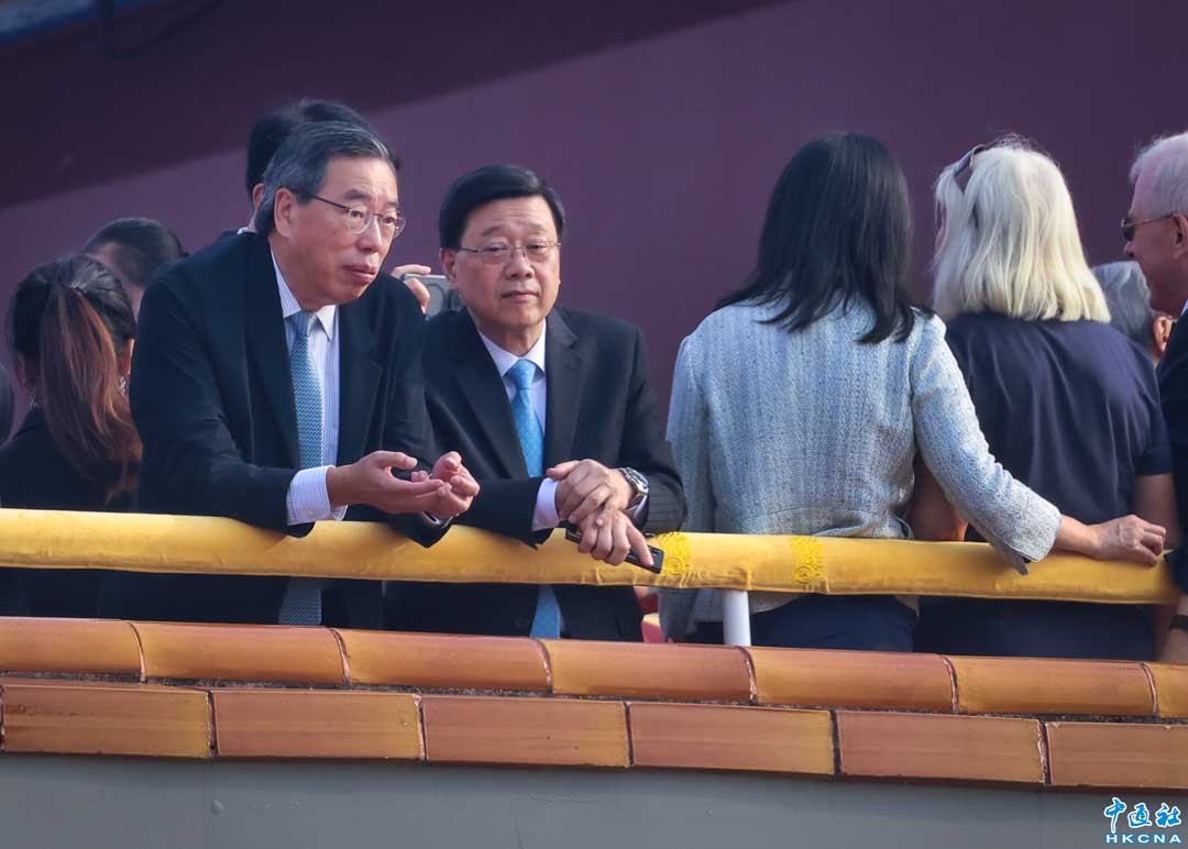 香港特區行政長官李家超(左二)、立法會議員主席梁君彥在天安門城樓出席紀念中國人民抗日戰爭暨世界反法西斯戰爭勝利80週年大會。(香港中通社記者 謝光磊攝)