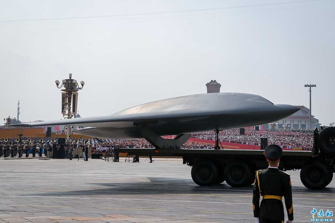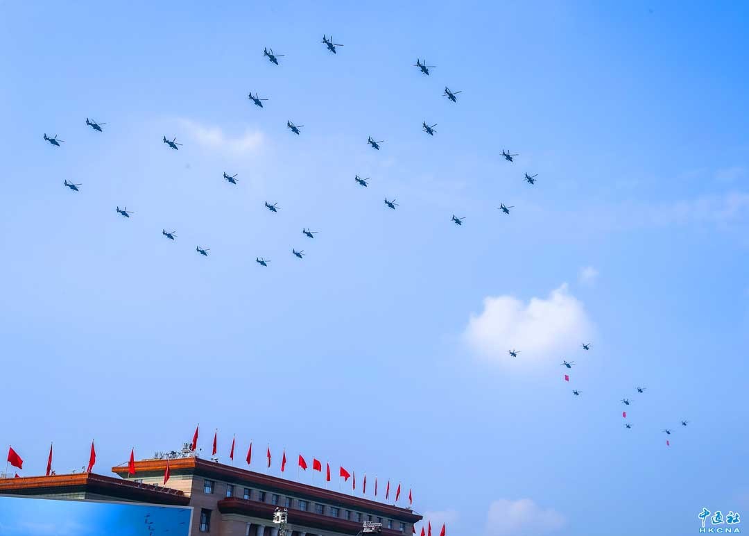 空中無人作戰方隊通過天安門廣場,接受祖國和人民檢閱。方隊新型察打一體無人機、無人僚機、艦載無人直升機等裝備,可隱蔽出擊、廣域覆蓋、自主協同,創新未來空戰新樣式。(香港中通社記者 謝光磊攝)