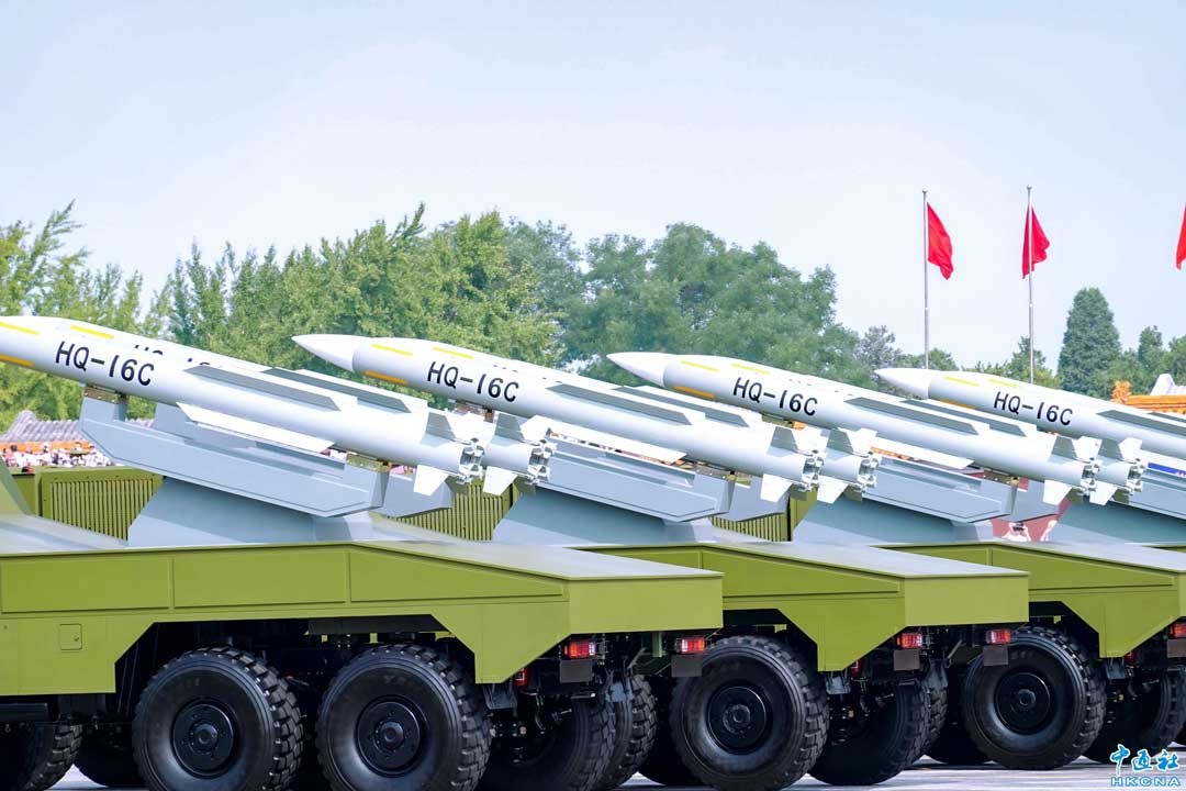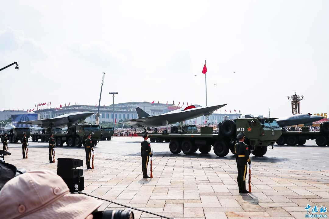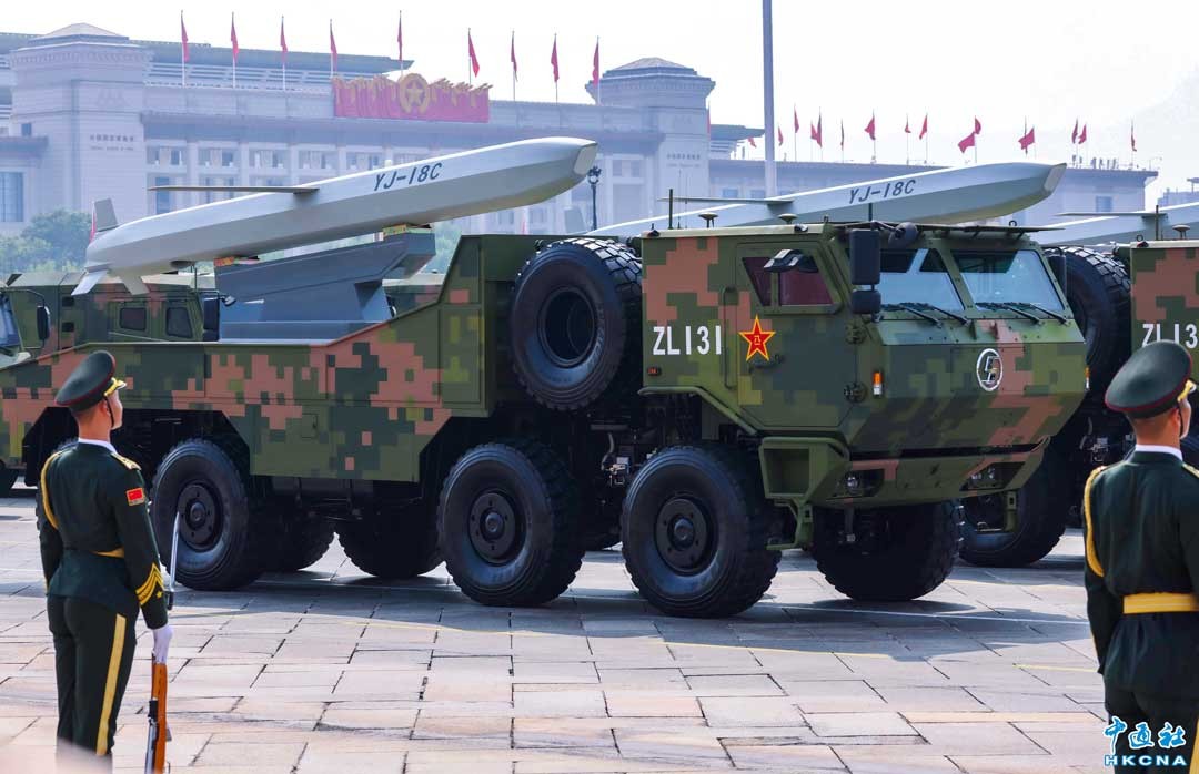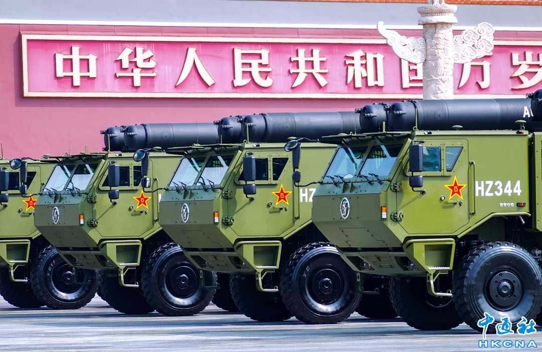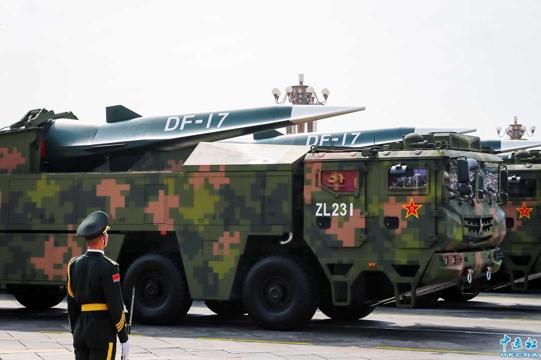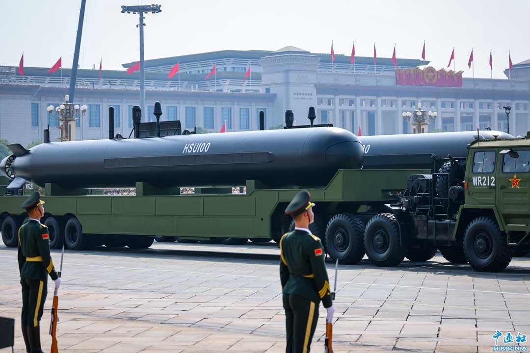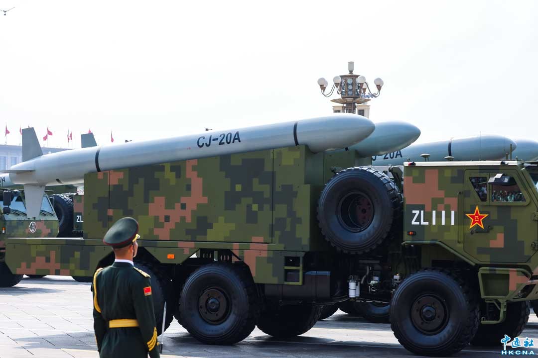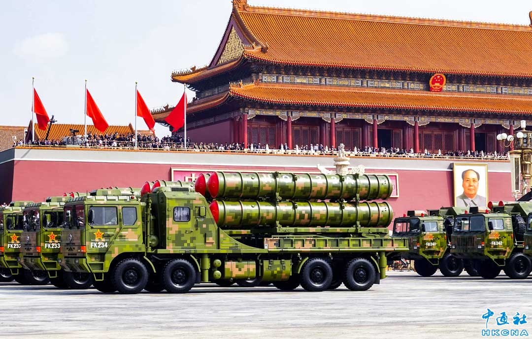 高超聲速導彈方隊通過天安門廣場,接受祖國和人民檢閱。這個方隊受閱的鷹擊-21、東風-17、東風-26D導彈,飛行速度快、突防能力強、命中精度高,是具備全天候作戰能力的新型殺手鐧。(香港中通社記者 謝光磊攝)