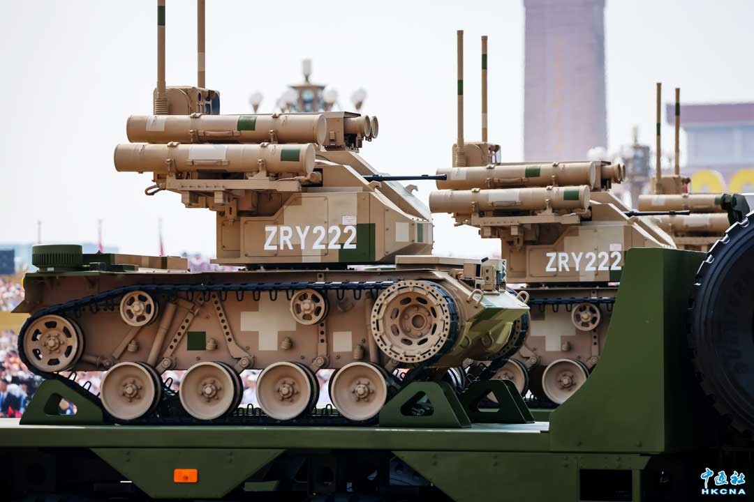 陸上無人作戰方隊通過天安門廣場,接受祖國和人民檢閱。受閱裝備為偵打突擊、掃雷排爆、班組支援等無人戰車。(香港中通社記者 謝光磊 攝)