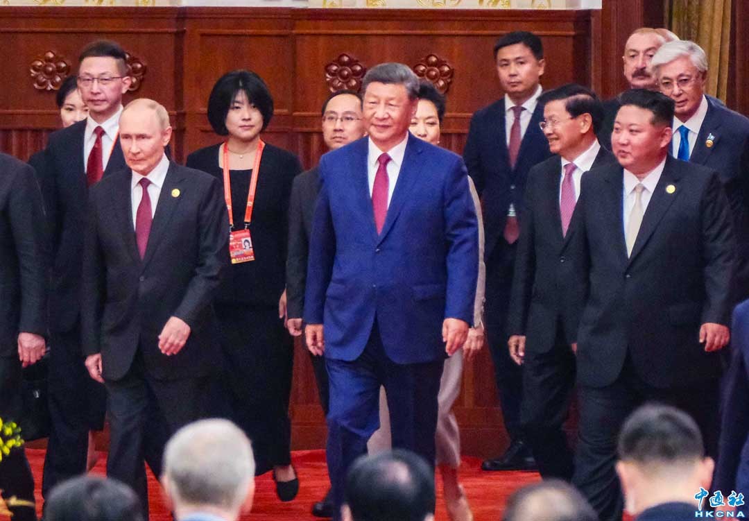 紀念中國人民抗日戰爭暨世界反法西斯戰爭勝利80周年招待會在人民大會堂舉行。圖為中共中央總書記、國家主席、中央軍委主席習近平(中)與俄羅斯總統普京(左)、朝鮮人民民主共和主席高領導人金正恩(右)步入會場。(香港中通社記者 許其皓攝)