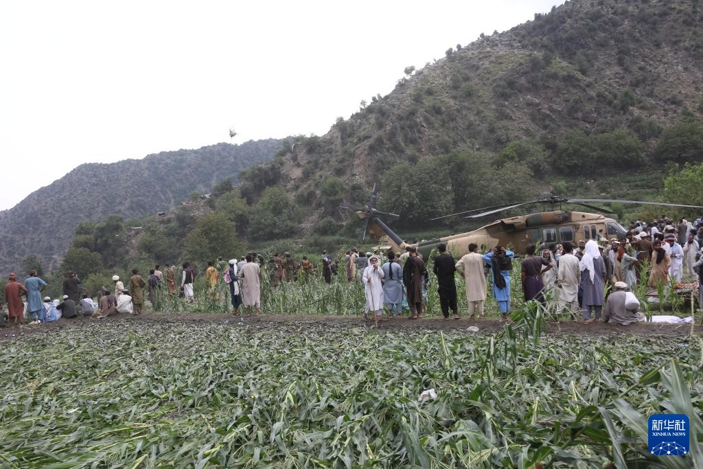 9月1日,在阿富汗庫納爾省努爾加爾的馬紮里峽谷,人們聚集在救援直升機附近。新華社發(塞夫拉赫曼·薩菲攝)