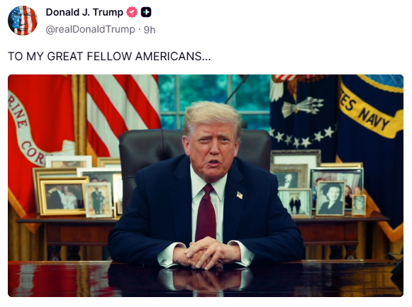 特朗普發表視頻講話(特朗普社媒截圖)