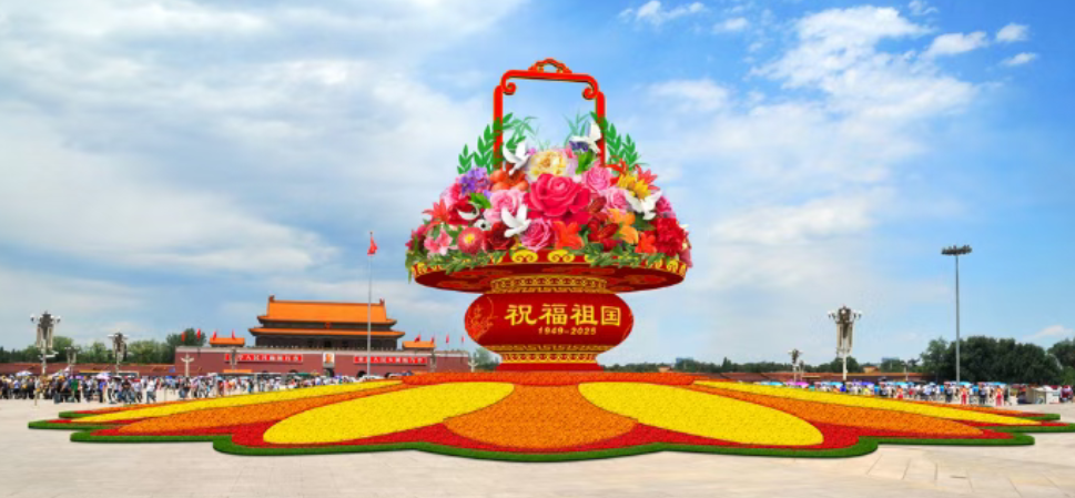 天安門廣場中心“祝福祖國”花壇以巨型花籃為主景,底部直徑45米,呈向日葵圖案,寓意葵花向陽。花籃高18米,籃體南側書“祝福祖國,1949-2025”,北側書“歡度國慶,1949-2025”。籃內選用荷花、月季、珙桐等花卉,結合和平鴿元素,寓意和平發展、欣欣向榮,表達對祖國繁榮和世界和平的美好祝願。