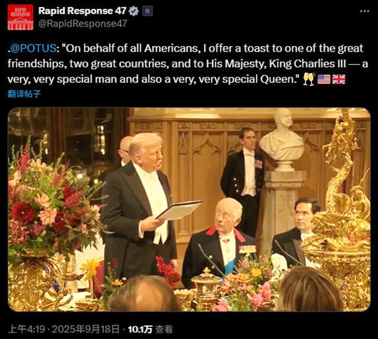 9月17日,英國國王查爾斯三世歡迎來訪的特朗普。圖自白宮X賬號