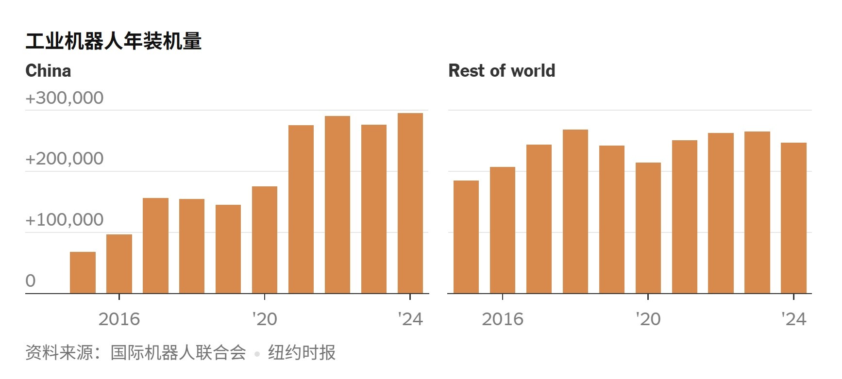 中國工業機器人年裝機量與全球其他地區對比(圖源:紐約時報)