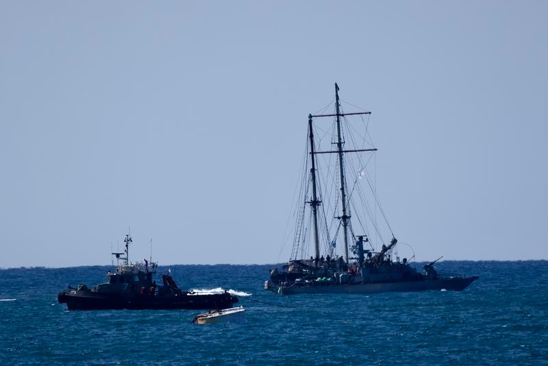 10月2日,在以色列南部阿什杜德港附近,“全球堅韌船隊”船隻被拖向港口。圖片來源:新華社