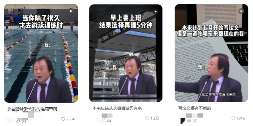 8月初,在小紅書、抖音等大陸社交平台上,“本來應該從從容容游刃有餘,現在是匆匆忙忙,連!滾!帶!爬!”這句過去王世堅“激情質詢”時爆出的話已悄然成為網絡熱梗,與“早上要上班,結果選擇再睡五分鐘”、“當你隔了很久才去游泳館訓練”、“本來計劃暑假猛寫作業”、“本來計劃要減肥”等情境“完美”適配,有一些網友還運用AI技術,對此進行重新演繹,也讓話題不斷發酵。