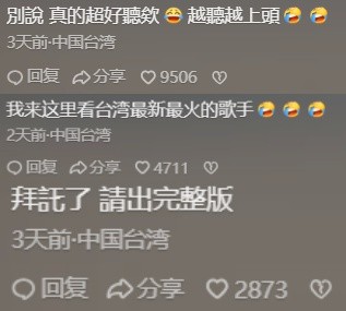 “視頻傳到哪了?”“傳到台北了!”不少台灣網友也慕名找到《沒出息》原視頻,紛紛直言“前來朝聖”“特別前來按讚”,讓評論區的“含台量”驟升。有台灣網友困惑:“怎麼在這還能看到熟人。”“到底是怎麼傳到這的。”有台灣網友驚訝:“我真的佩服所有大陸網友,太有才華了啦!!!”“真的超好聽欸,越聽越上頭。”有台灣網友“建議”:“做成整首應該會大賣。”“佳金曲獎!”