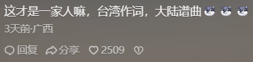 還有網友表示,“台灣作詞,大陸作曲,這就是兩岸一家親。”