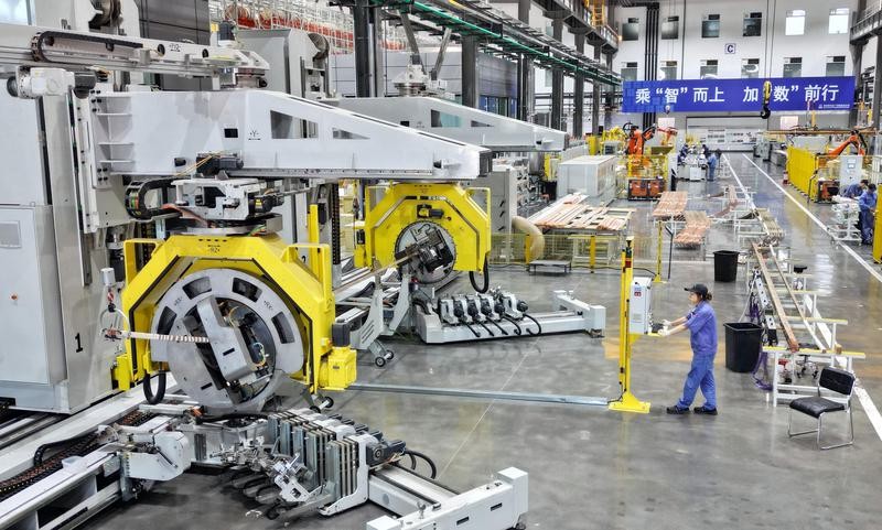 資料圖為哈爾濱電機廠智能製造車間,工人在進行生產作業(無人機照片)。圖片來源:新華社
