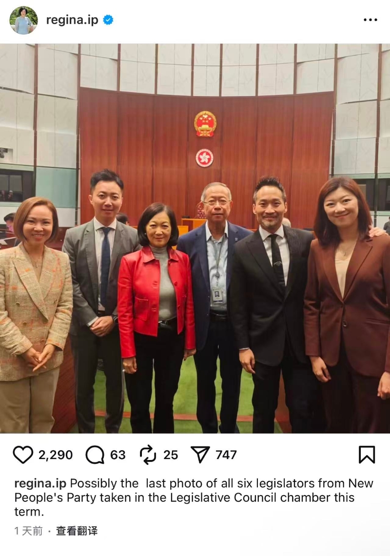 葉劉淑儀22日出席立法會後一次大會時,與另外5名黨友在會議廳打卡,並在社交平台發文表示“可能是今屆新民黨在議會的後一次合照”。