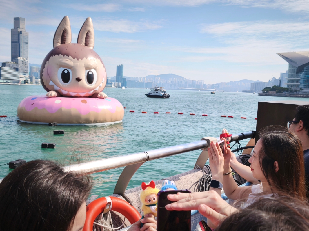 香港新聞網10月26日電(記者洪少葵)10月26日,巨型海上充氣雕塑公仔成為市民與遊客爭相“打卡”之處。不少市民帶同自己喜歡的玩偶拍照留影。“維港海上大巡游”活動25日起亮相香港金鐘添馬公園海濱,4個巨型充氣公仔包括多啦A夢、KAWS & 芝麻街(Elmo)、滑嘟嘟及LABUBU在維港展出,並於下月1日舉行“海上大巡遊”。