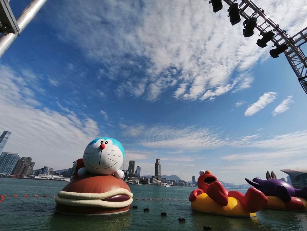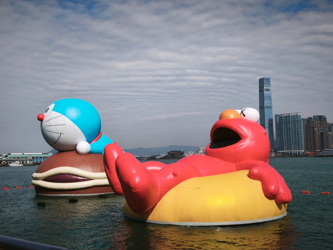 “維港海上大巡游”活動25日起亮相香港金鐘添馬公園海濱,4個巨型充氣公仔包括多啦A夢、KAWS & 芝麻街(Elmo)、滑嘟嘟及LABUBU