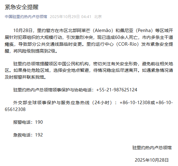 香港中通社10月29日電 據中國駐里約熱內盧總領館29日消息,10月28日,巴西里約熱內盧警方在市區北部阿萊芒(Alemão)和佩尼亞(Penha)等區域開展針對犯罪組織的大規模行動,引發激烈衝突,現已造成60餘人死亡,市內多條主幹道癱瘓,導致部分公共交通線路臨時變更。