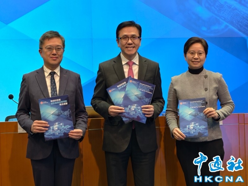 11月20日,香港特區政府公佈《新田科技城創科產業發展規劃概念綱要》。創新科技及工業局局長孫東(左二)在當天的記者會上介紹綱要内容,創新科技及工業局常任秘書長蔡傑銘(左一)和創新科技及工業局副秘書長鄭嘉慧(左三)亦有出席。(香港中通社記者 梁嘉軒攝) 香港中通社圖片