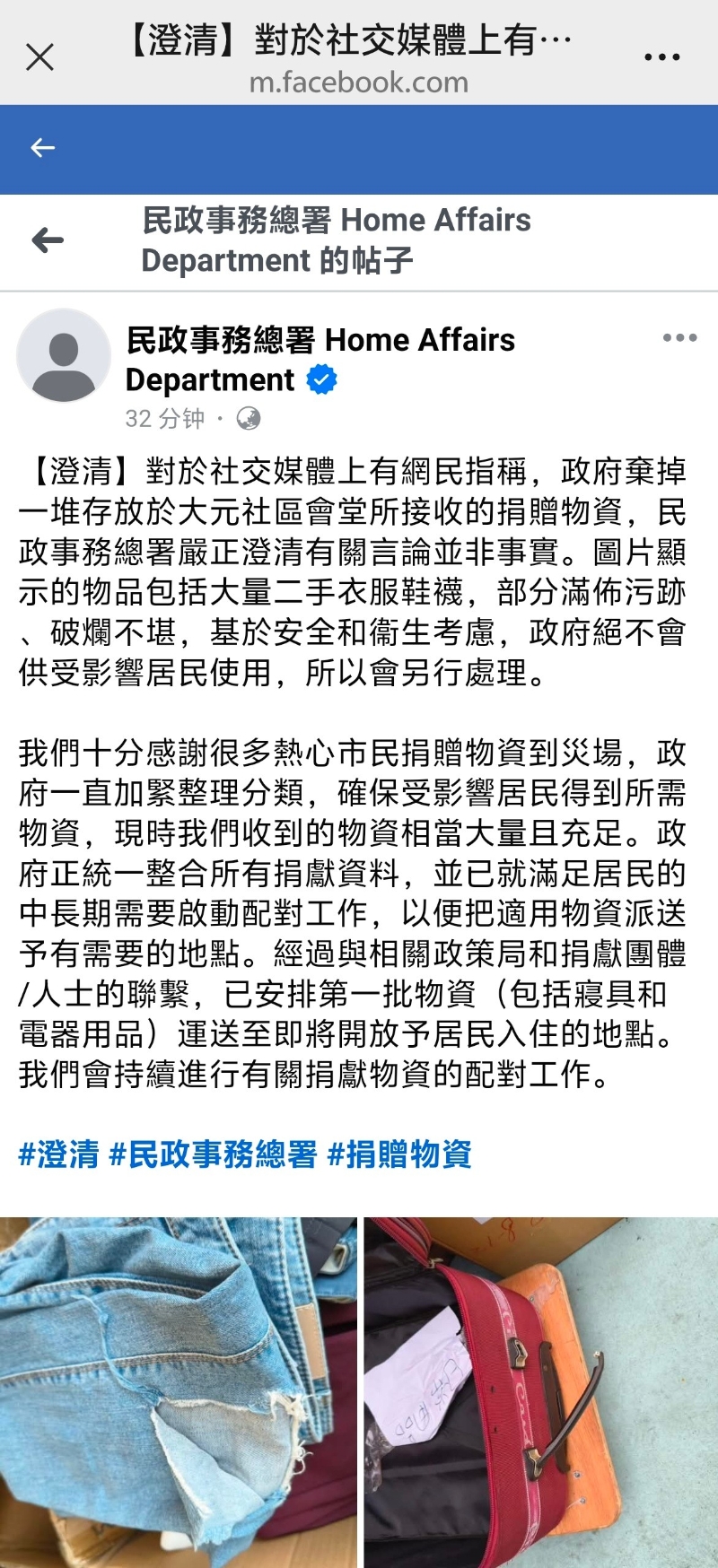 署方指,圖片顯示的物品包括大量二手衣服鞋襪,部分满佈污跡破爛不堪,基於安全和衛生考虑,政府絕不会供受影響居民使用,所以會另行處理。