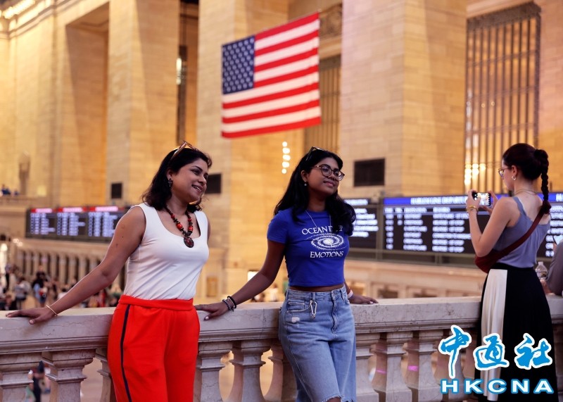 圖為遊客在美國國旗下拍照留念。 香港中通社資料圖片