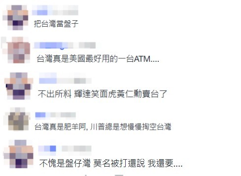 相關消息引起台灣輿論高度關注。有島內網友自嘲,若傳聞為真,台灣又被美國當盤子,“台灣真是美國好用的一台ATM”“台灣真是肥羊啊, 特朗普總是想慢慢掏空台灣”“不愧是盤仔灣”……