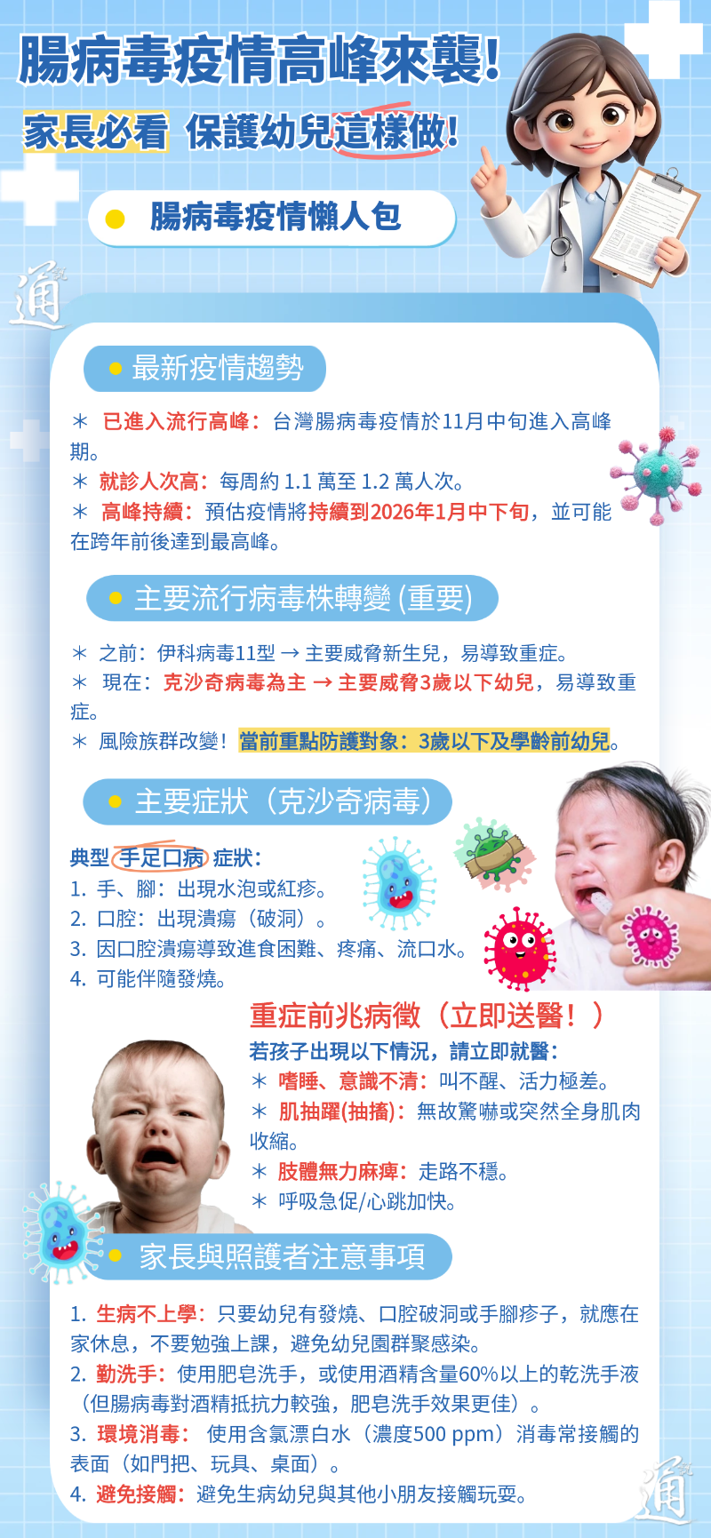 此外,新生兒腸病毒感染併發重症的確定病例也累積達15例。疾管署特別呼籲,新生兒感染腸病毒可能會出現發燒或低體溫、活力不佳等情況,且病情發展快速,未及時治療可能發展為心肌炎、肝炎、腦炎等重症,嚴重可能威脅生命,因此一旦有上述症狀,務必儘速就醫。