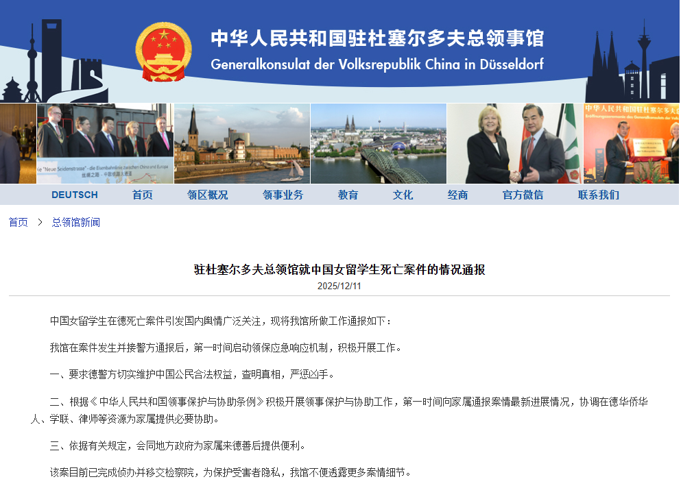 香港中通社12月11日電 中國駐杜塞爾多夫總領館12月11日就中國女留學生死亡案件發布情況通報,中國女留學生在德死亡案件引發國內輿情廣泛關注,領館在案件發生並接警方通報後,第 一時間啟動領保應急響應機制,積極開展工作。
