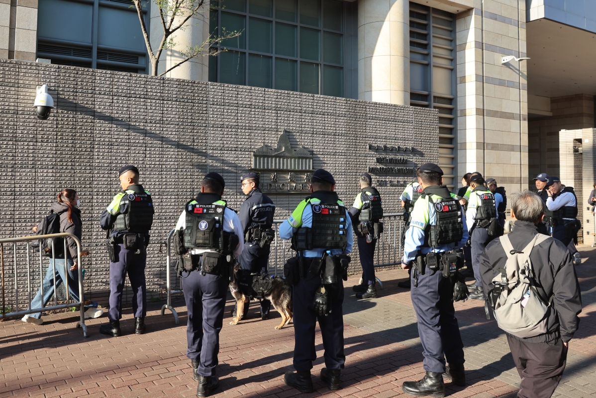 12月15日,壹傳媒創辦人黎智英與《蘋果日報》3間相關公司涉嫌串謀勾結外國勢力案今早宣佈判決,西九龍裁判法院外保安措施顯著加強,多名穿著防刺戰術背心的警員在場巡邏,警方亦設置路障,所有進入法庭的車輛,均需接受安檢。(記者 謝光磊 攝)