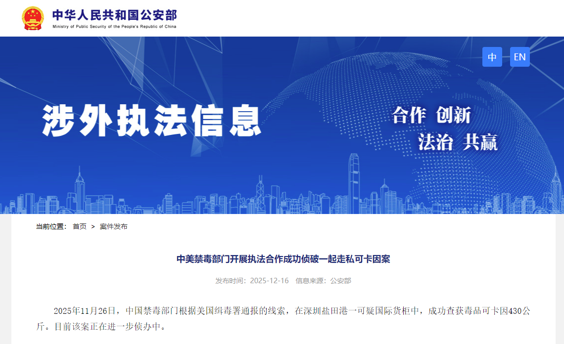 香港中通社12月16日電 據中國公安部12月16日消息,11月26日,中國禁毒部門根據美國緝毒署通報的線索,在深圳鹽田港一可疑國際貨櫃中,成功查獲毒品可卡因430公斤。
