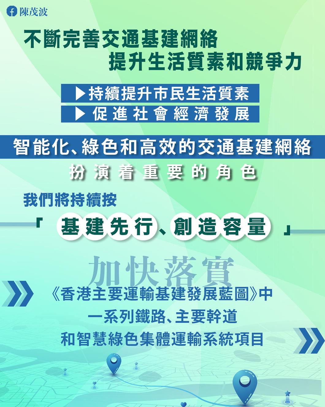 他強調,智能化、綠色和高效的交通基建網絡扮演著重要的角色,未來會繼續按“基建先行、創造容量”方針,加快落實《香港主要運輸基建發展藍圖》中提出的一系列鐵路、主要幹道和智慧綠色集體運輸系統項目。