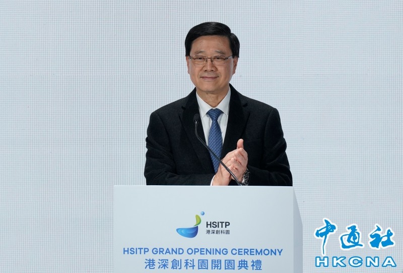 圖為行政長官李家超出席河套港深創新及科技園開園典禮並致辭。 香港中通社圖片