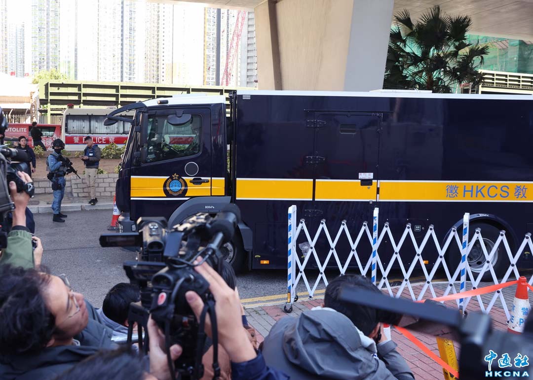 12月15日,壹傳媒創辦人黎智英與《蘋果日報》3間相關公司涉嫌串謀勾結外國勢力案今早宣佈判決,三名國安法指定法官裁定黎智英兩項串謀勾結外國勢力罪及一項串謀發布煽動刊物罪成立。圖為押送黎智英的囚車駛離西九龍裁判法院。(香港中通社記者 謝光磊 攝)