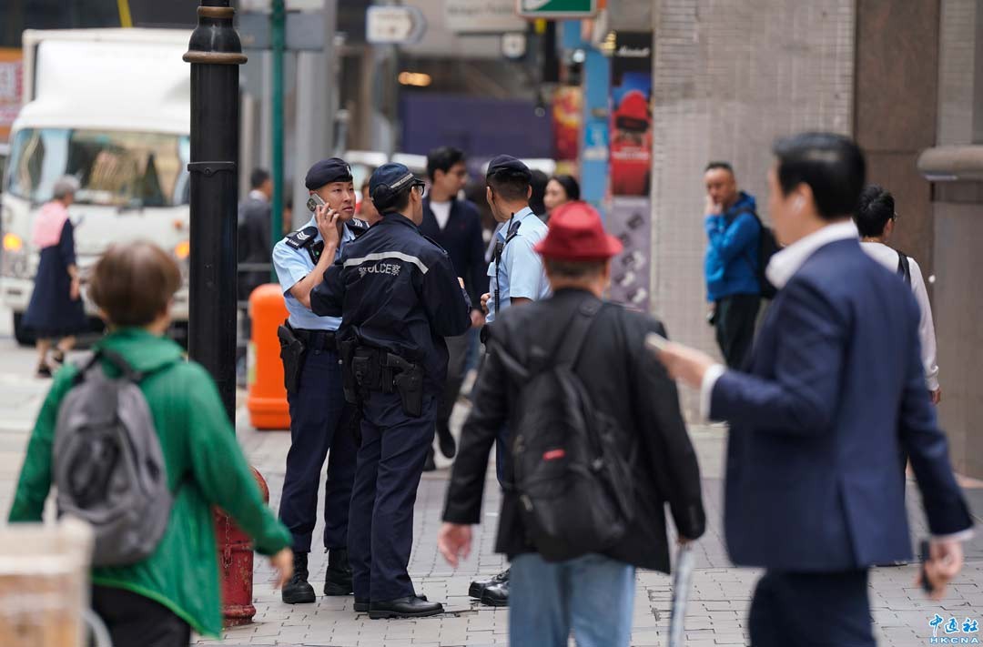 12月18日,香港警方接獲一名找換店男職員報案,指與同事在上環皇後大道中181號新紀元廣場對開,遭4名持刀男子截劫,報稱被搶去約10億日圓,折合港幣約5000萬,賊人得手登車逃走。圖為事發皇後大道中181號新紀元廣場附近有警員在場駐守。(香港中通社記者 陳奕啟 攝)