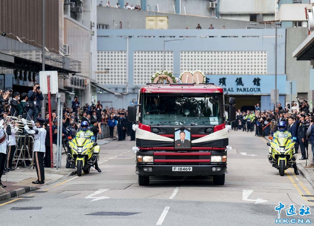 12月19日,香港消防處在九龍紅磡世界殯儀館為已故消防隊目(追授)何偉豪舉行高榮譽喪禮。何偉豪靈柩蓋上特區區旗,抬上消防靈車。當日,香港特區行政長官李家超、多位特區政府官員出席悼念。在殯儀館外,多位特區政府官員、消防人員列隊,向何偉豪作後致敬。(香港中通社記者 陳奕啟 攝)