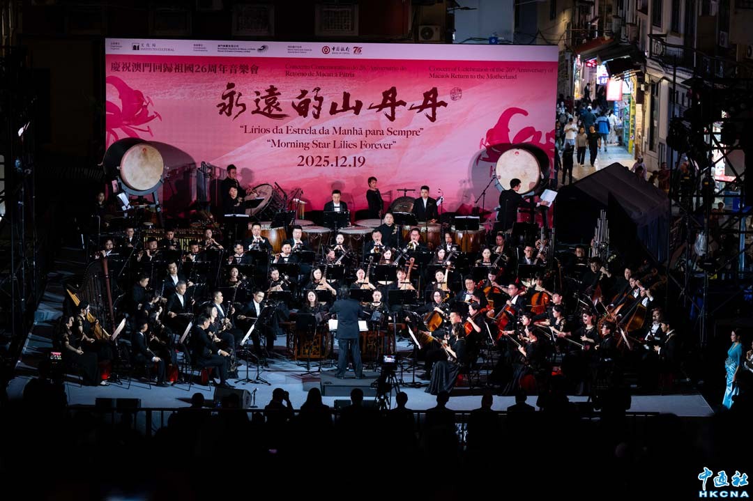 12月19日,澳門文化局主辦的慶祝澳門回歸祖國26周年音樂會《永遠的山丹丹》在大三巴牌坊前地上演,澳門中樂團以一場氣勢恢宏的民族音樂盛典,熱烈慶祝澳門回歸祖國26周年。 香港中通社圖片