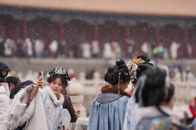 2025年12月12日,遊客在北京故宮賞雪拍照。新華社圖片